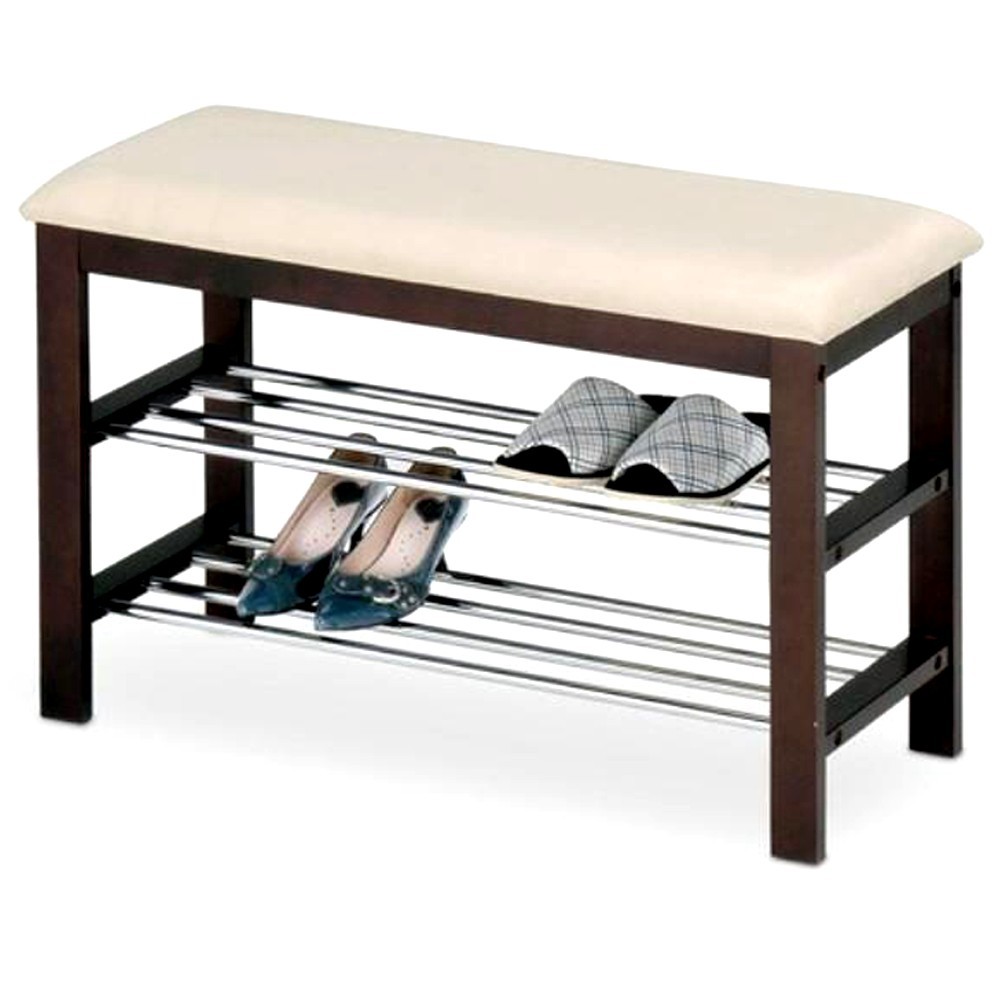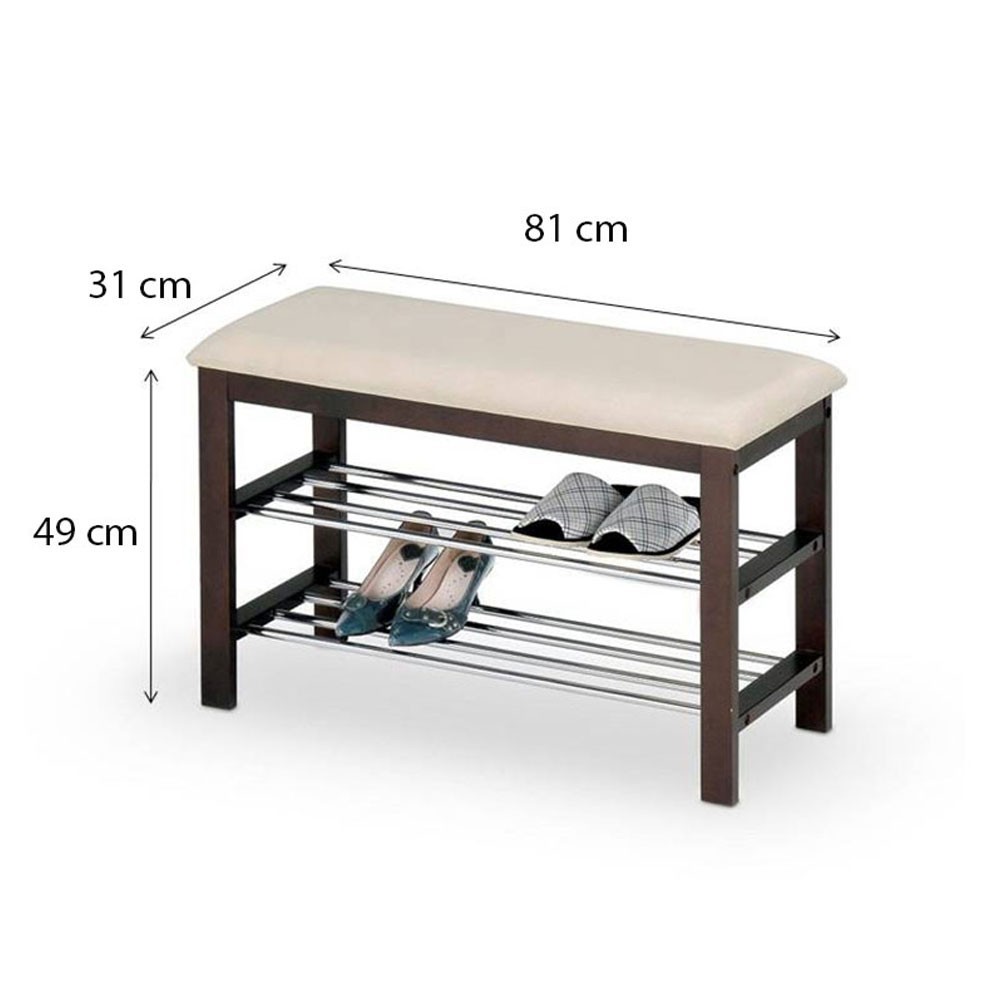 Suport pantofi tip taburete wenge/crem din metal cromat si lemn masiv, tapitat cu piele ecologica.