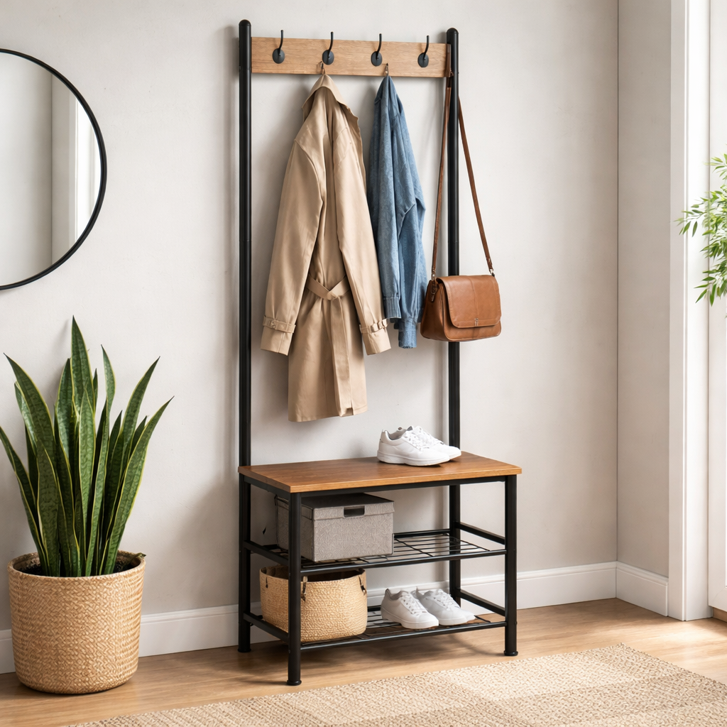 Principalul avantaj al acestui cuier pentru hol este multifunctionalitatea. Cele 4 agatatori permit depozitarea organizata a hainelor, paltoanelor, gentilor sau accesoriilor, in timp ce cele 2 rafturi din plasa metalica sunt ideale pentru pantofi, genti sau cutii de depozitare. Spatiul de odihna integrat, cu o capacitate de incarcare de pana la 80 kg, ofera un plus de confort si functionalitate, fiind perfect pentru incaltare sau utilizare temporara.