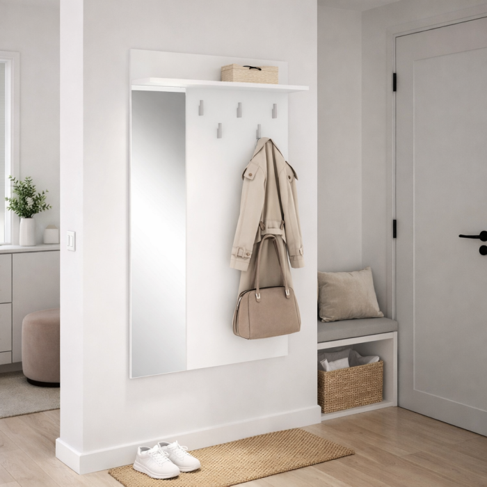 Realizat din PAL melaminat rezistent, acest cuier de perete este gandit pentru utilizare frecventa si pentru a rezista in timp. Materialul este durabil, usor de intretinut si protejat impotriva uzurii zilnice, ceea ce il face ideal pentru locuintele active sau pentru spatii utilizate intens. Finisajul in culoarea alb ofera un aspect modern si luminos, integrandu-se usor in amenajari minimaliste, contemporane sau scandinave si contribuind la crearea unui hol aerisit.