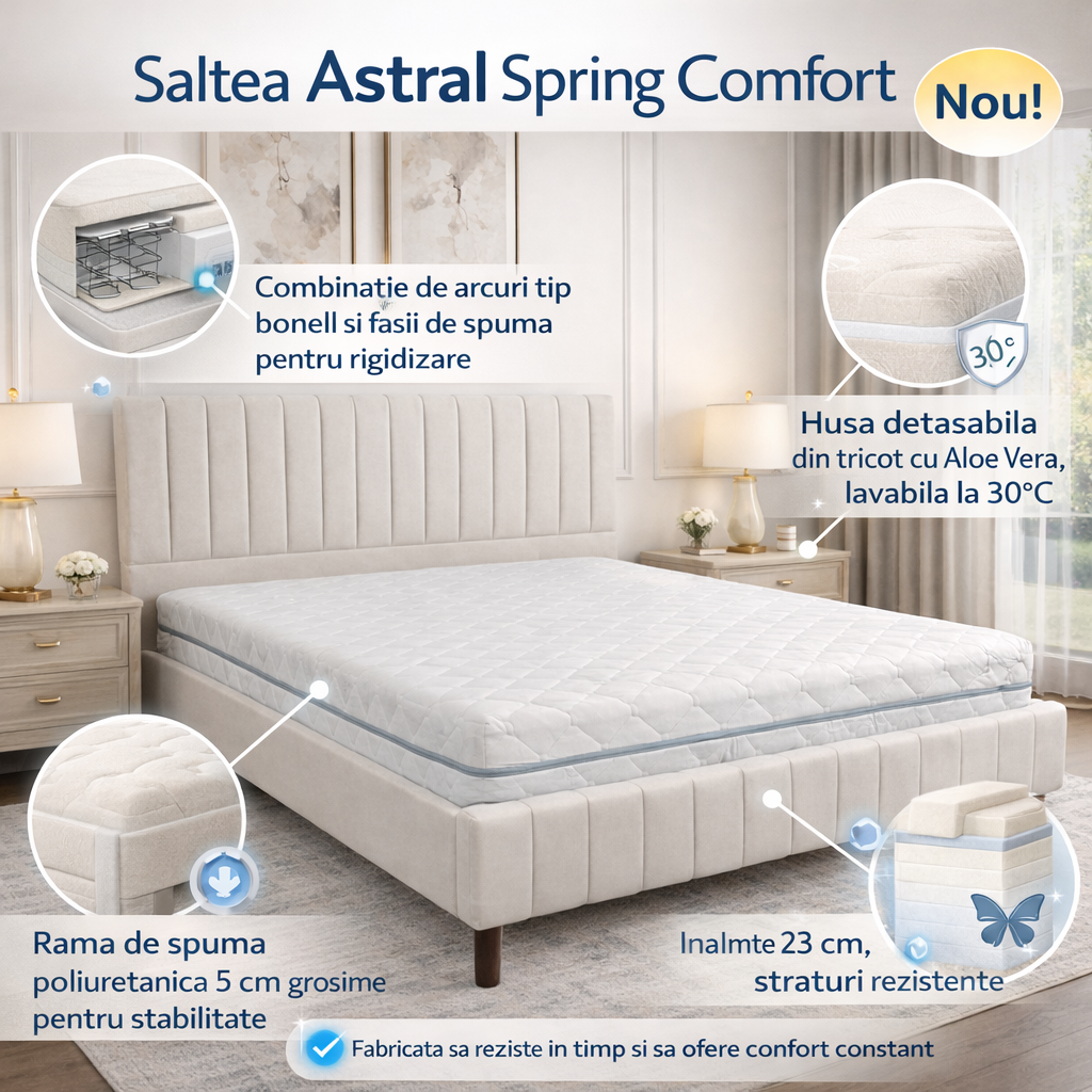 Salteaua Astral Spring Comfort are o duritate tare, fiind ideala pentru persoanele care prefera o sustinere ferma in timpul somnului. Aceasta caracteristica ajuta la mentinerea unei pozitii corecte a coloanei vertebrale si la reducerea punctelor de presiune.