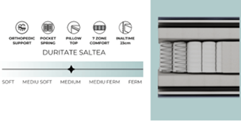 Salteaua este prevazuta cu un strat superior Pillow Top, care ofera o senzatie placuta de confort si relaxare imediat ce te asezi. Acest strat contribuie la reducerea presiunii asupra umerilor si soldurilor si imbunatateste calitatea somnului.