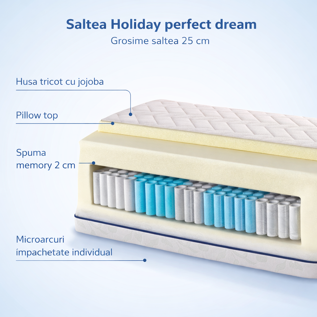 Salteaua Holiday Perfect Dream 180x200 cm este creata pentru a oferi un nivel superior de confort si sustinere, datorita combinatiei dintre microarcuri impachetate individual dispuse in 7 zone de confort si materiale premium atent selectate. Aceasta structura moderna permite adaptarea saltelei la fiecare zona a corpului, contribuind la o pozitie corecta si relaxata in timpul somnului.