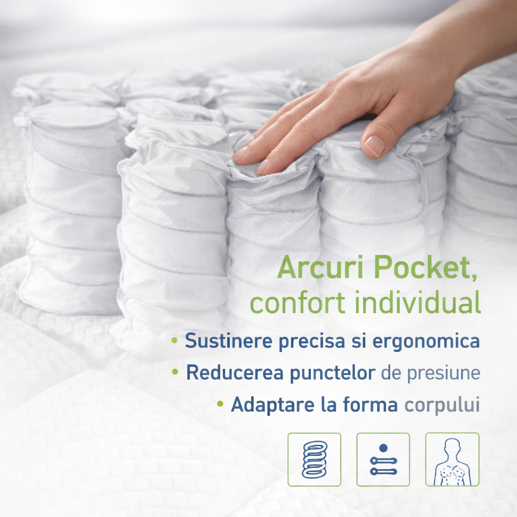 Fiecare arc functioneaza independent, adaptandu-se miscarilor corpului si contribuind la optimizarea distributiei greutatii. Astfel, punctele de presiune sunt reduse, iar corpul beneficiaza de un suport echilibrat pe toata durata noptii.