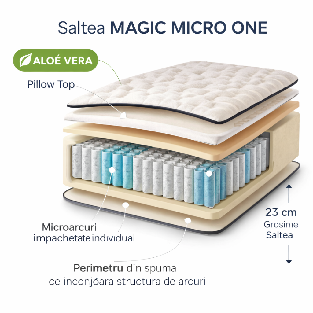 Datorita tehnologiei cu microarcuri si structurii ergonomice cu 7 zone de confort, salteaua Magic Micro One 160x200 cm ofera o combinatie excelenta intre sustinere ortopedica si confort. Este alegerea potrivita pentru persoanele care isi doresc un somn odihnitor, o sustinere corecta a coloanei si un produs durabil, conceput pentru utilizare zilnica.