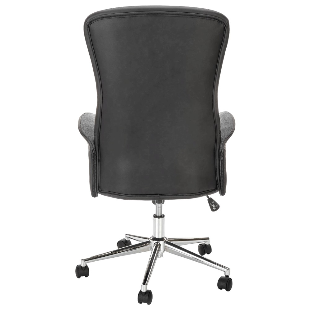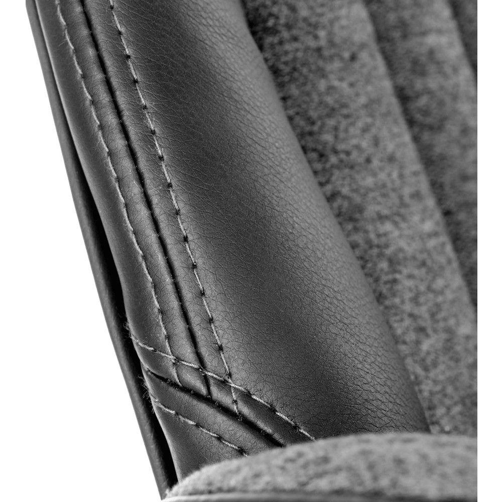 Sezutul si spatarul sunt tapitate cu stofa pe interior, iar in exterior scaunul este prevazut cu piele ecologica moale.