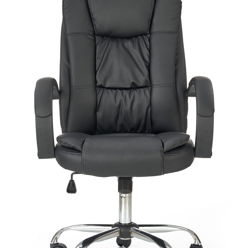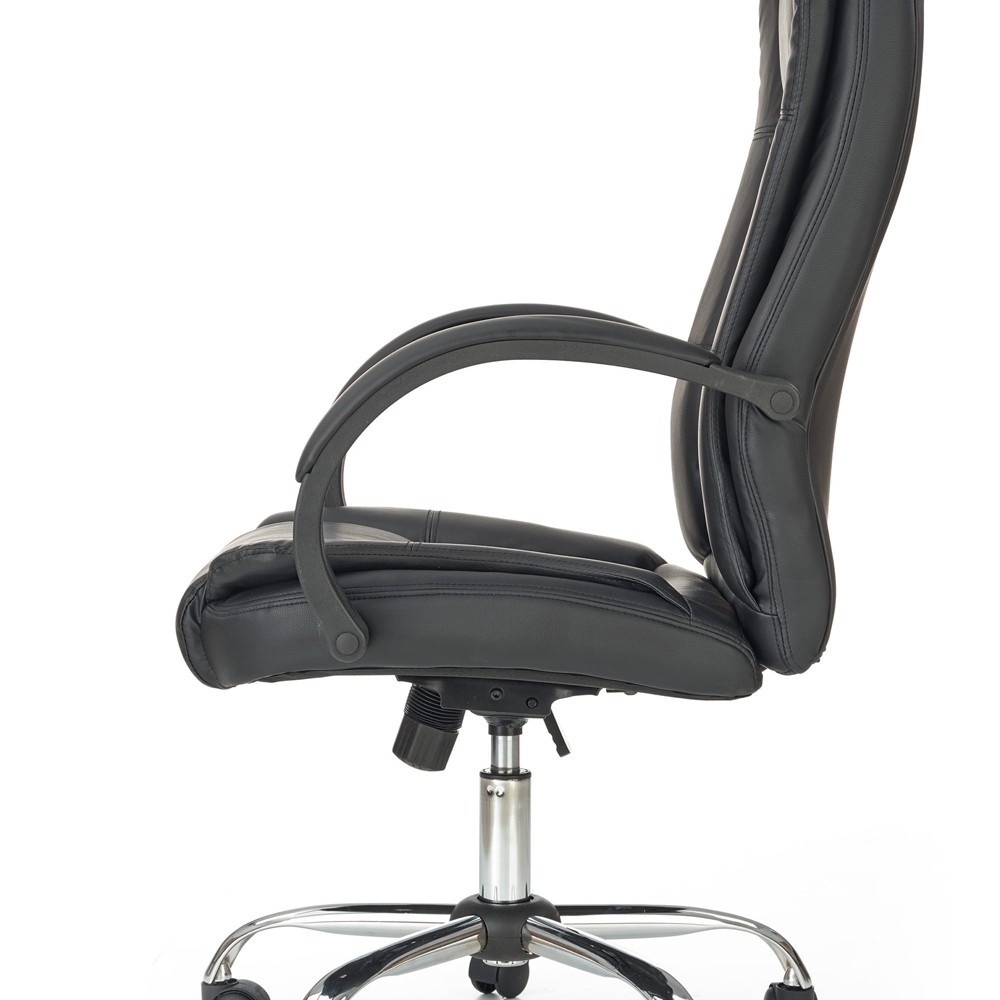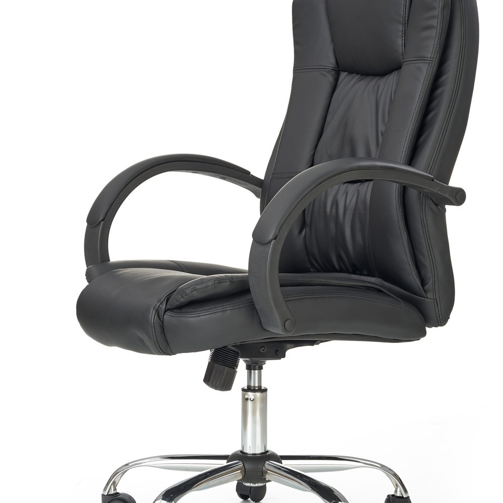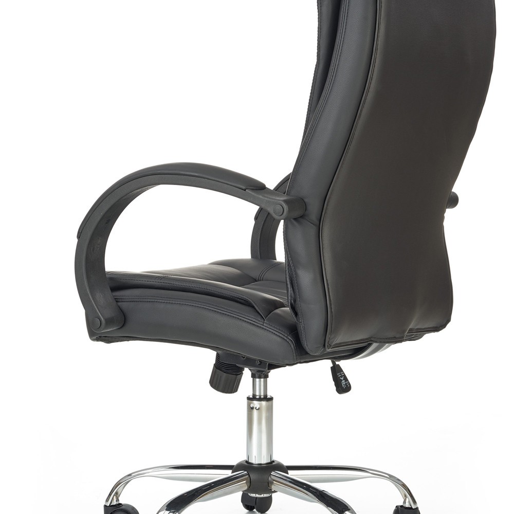 Scaunul are baza stelara din metal cromat, tapiterie din piele ecologica neagra si brate din polipropilena acoperite cu piele ecologica.