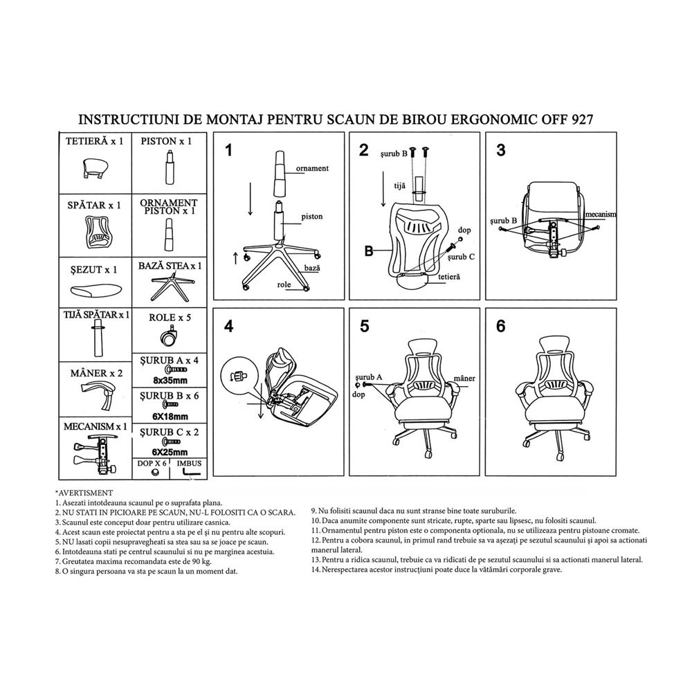 Scaunul de birou ergonomic OFF 927 este un fabricat din material textil, stofa, pentru sezut, iar spatarul este acoperit cu plasa de tip mesh. Scaunul beneficiaza de un suport de picioare, ce se ascunde sub sezut atunci cand nu este folosit.