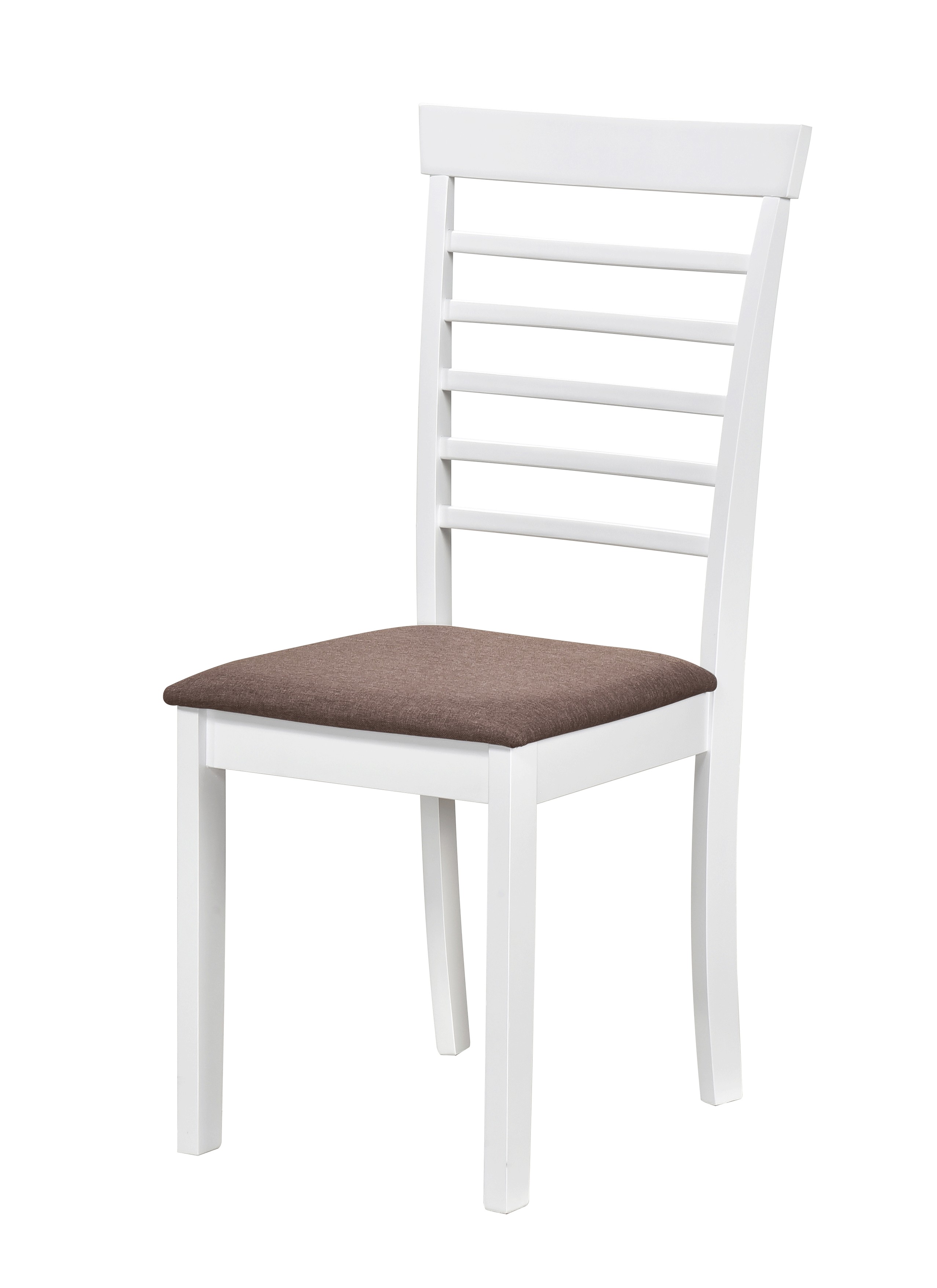 Scaun elegant cu cadru din lemn masiv alb si sezut tapitat cu stofa maro, usor de intretinut.