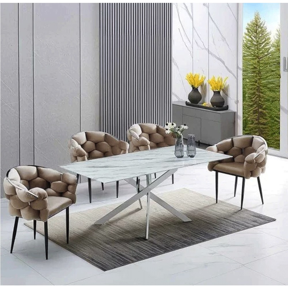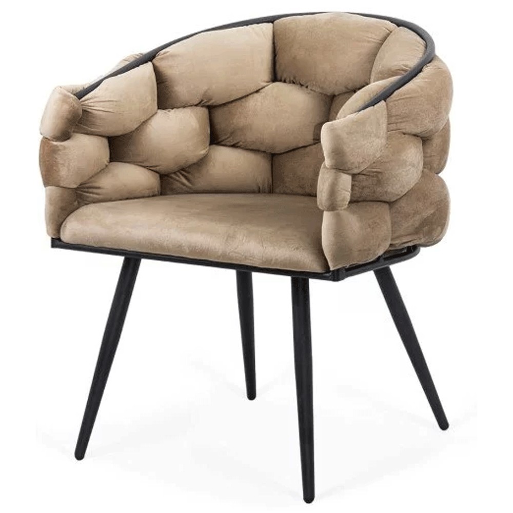Scaunul living din catifea BUC256 este o alegere remarcabila, captand privirile prin detalii deosebite. Scaunul impresioneaza prin dimensiunile sale generoase si sezutul adanc, avand forma unui fagure care confera o perceptie unica mobilierului. Structura sa se bazeaza pe picioare metalice.