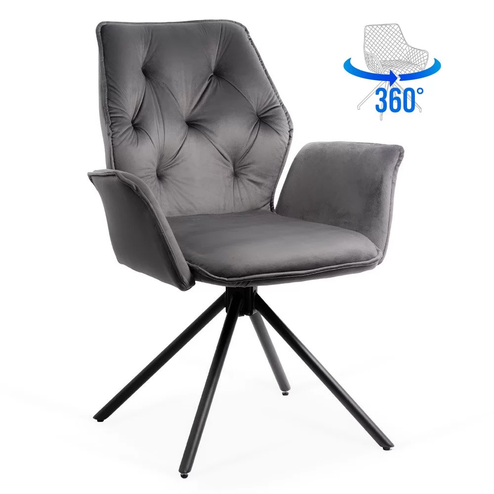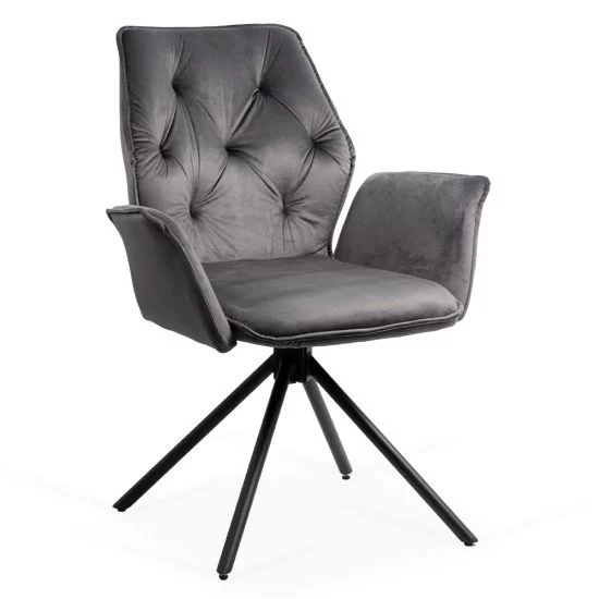 Cu un sezut si spatar tapitate in catifea moale, scaunul ofera o senzatie catifelata la fiecare atingere. Bratele capitonate adauga un plus de confort, sustinand relaxarea naturala a bratelor, in timp ce baza metalica solida, cu picioare tip spider, garanteaza stabilitate si rezistenta in utilizare zilnica.