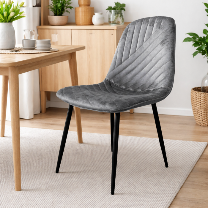 Designul contemporan, cu linii curate si spatar cu forma conica, confera scaunului un aspect aerisit si modern, usor de integrat in decoruri minimaliste, industriale sau urbane. Tapiteria din catifea gri adauga un accent sofisticat si elegant, fiind placuta la atingere si extrem de versatila din punct de vedere cromatic. Nuanța neutra permite combinarea usoara cu mese din lemn, metal sau sticla, completand armonios ambientul.