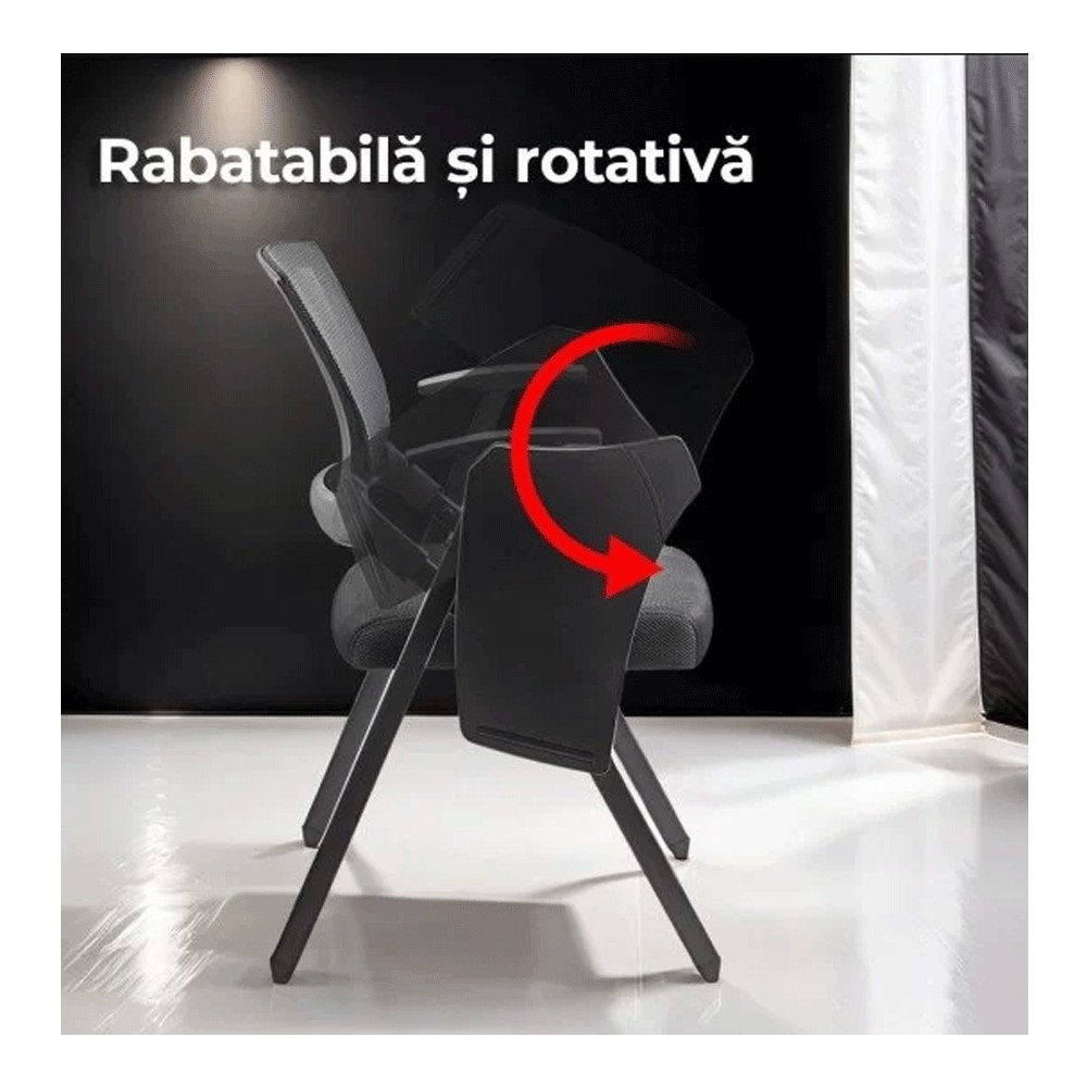 Confortul este asigurat de tapițeria din mesh de înaltă calitate și spătarul ergonomic, care oferă suport optim pentru coloană vertebrală chiar și în timpul ședințelor prelungite. Funcționalitatea este completată de măsuța rabatabilă, perfectă pentru a-ți ține la îndemână laptopul, notițele sau o ceașcă de cafea.
