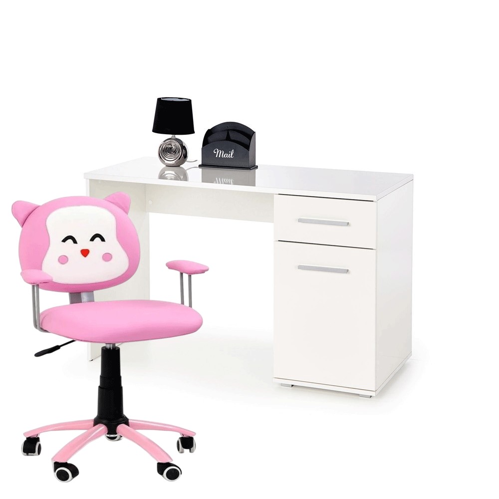 Set birou copii HM Lima B1, usa si sertar, Pal melaminat, alb si scaun birou HM Kitty, piele ecologica, Mecanism de balans, 80 Kg, roz