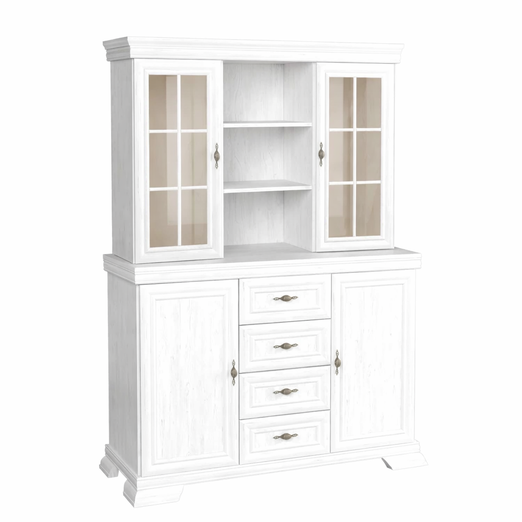Comoda este conceputa din PAL Melaminat si plinte decorative din MDF cu manere metalice aurii, iar vitrina este prevazuta cu doua usi acoperite cu sticla.