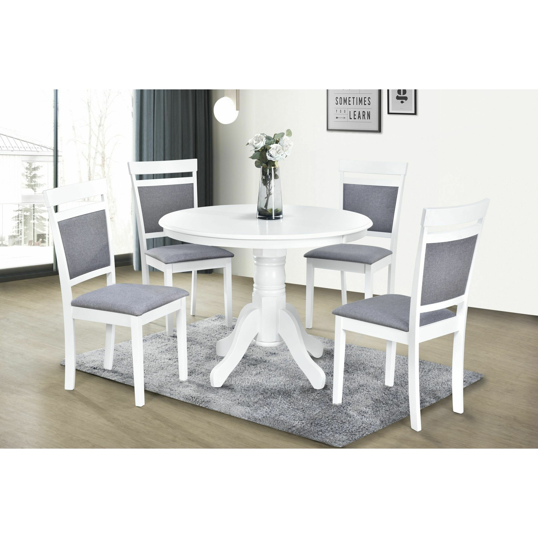 - Combinatie cromatica rafinata: Finisajul alb imaculat al mesei si scaunelor, completat de tapiteria gri a scaunelor, creeaza un contrast subtil si elegant, adaugand un plus de lumina si aerisire incaperii.