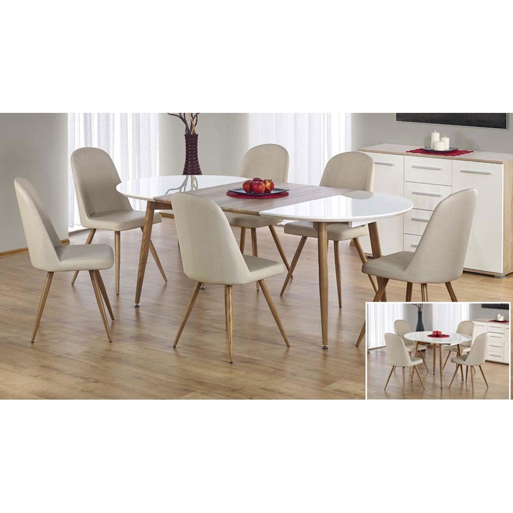 Scaunul este tapitat cu piele ecologica bej cu nuanta de gri iar picioarele sunt metalice vopsite in culoarea lemnului.Â