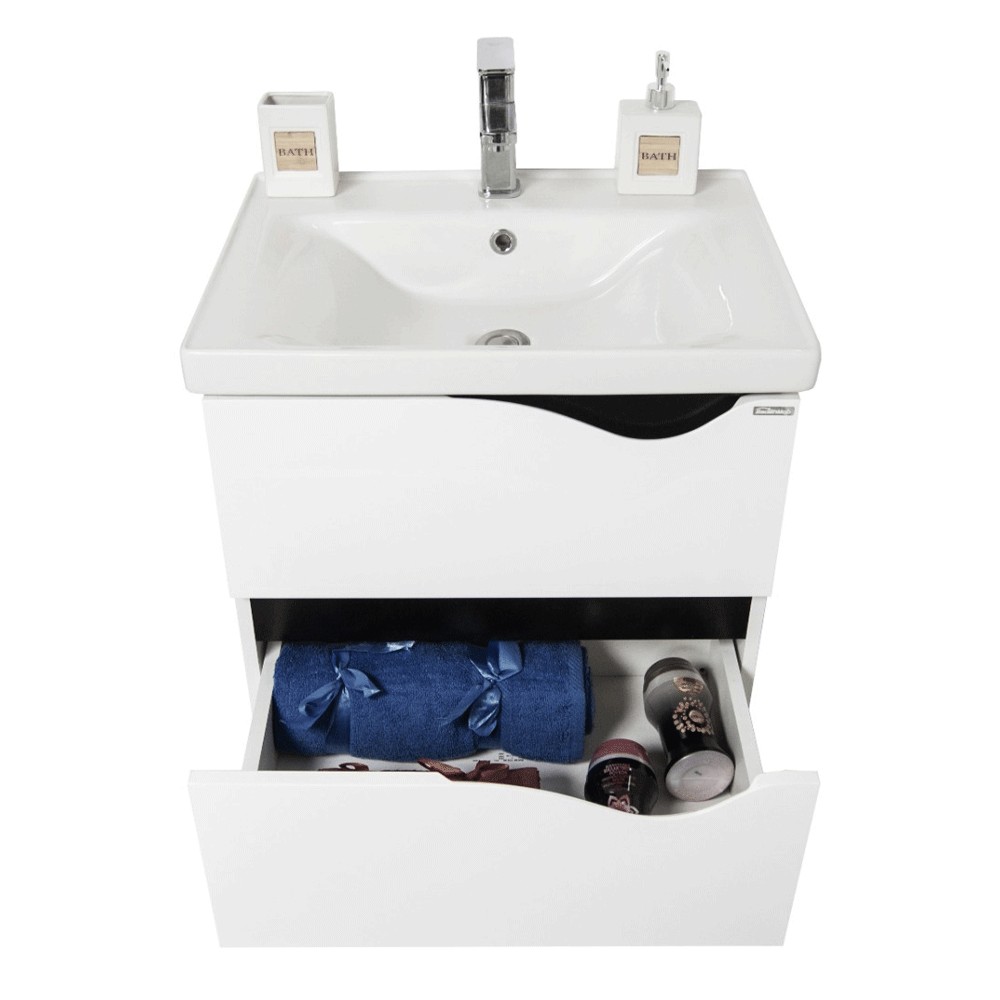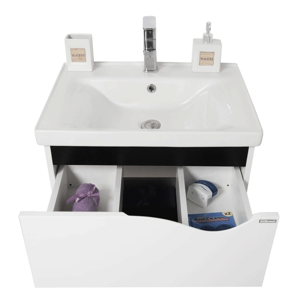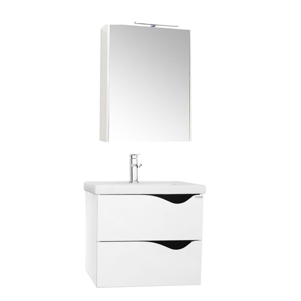 Avand un finisaj cu fronturi din MDF, vopsit alb, mobilierul va stabili standardul de eleganta al incaperii fiind completat si de lavoarul dreptunghiular din ceramica, ce se armonizeaza perfect cu baza.