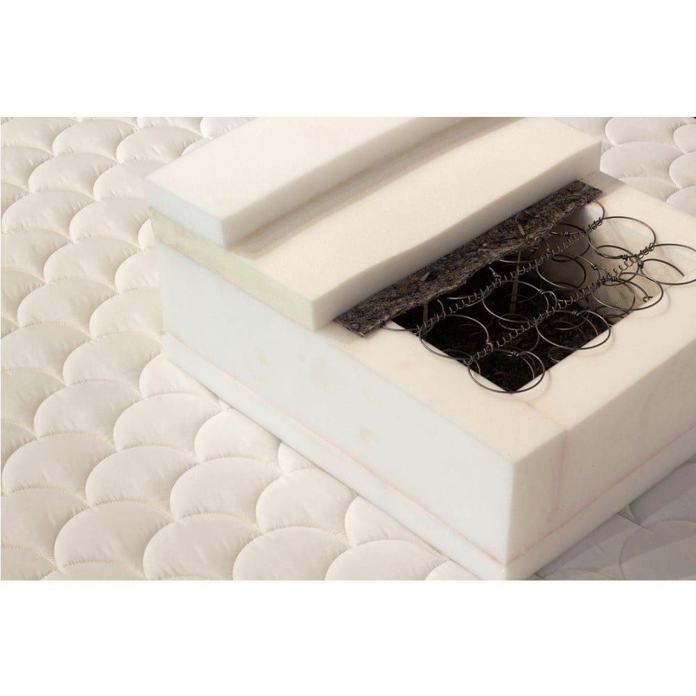 Salteaua Superlux 160x200 Iris este confectionata dintr-o plasa de arcuri Bonell cu diametrul de 8 cm, din sarma otel carbon 2,2mm, tratata termic la curenti de inalta frecventa, ceea ce confera o rezistenta indelungata a elasticitatii sarmei. Aceste arcuri ce beneficiaza de “box spring system” sunt legate intre ele prin intermediul unei sarme elicoidale crescand astfel gradul de duritate al saltelei.
