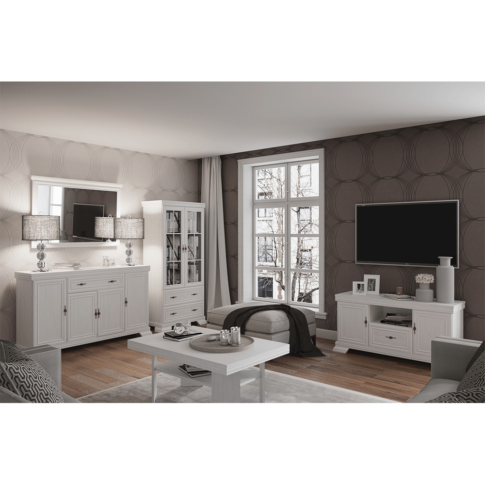 Finisajul din PAL de 22 mm cu decoratiuni din MDF, picioare stilizate si masive, manerele decorative stil buton asigura eleganta si rafinament vitrinei VMN4.Â